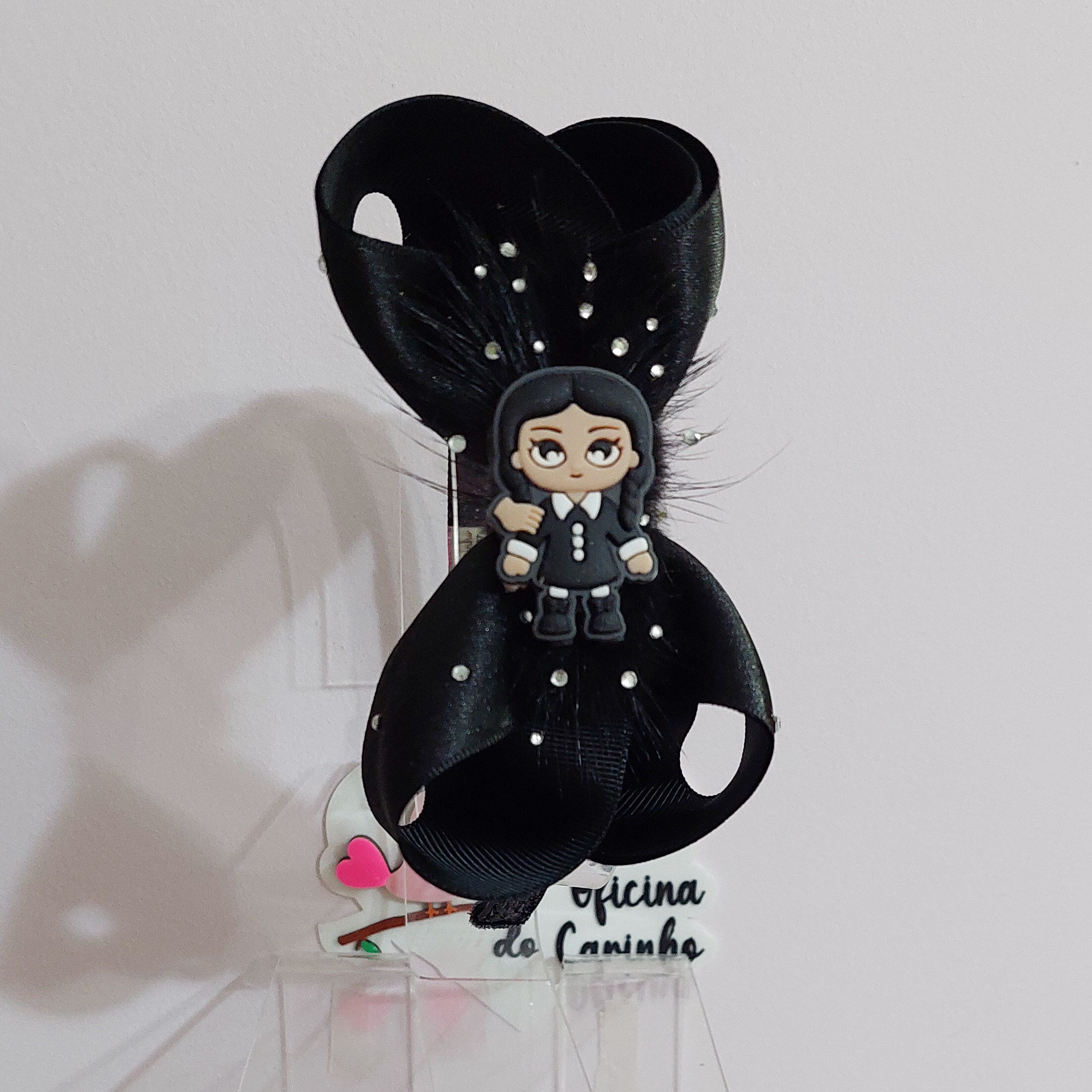 Tiara de dentinhos com laço preto e a personagem Wandinha sobre uma pelúcia preta com brilhos no laço.